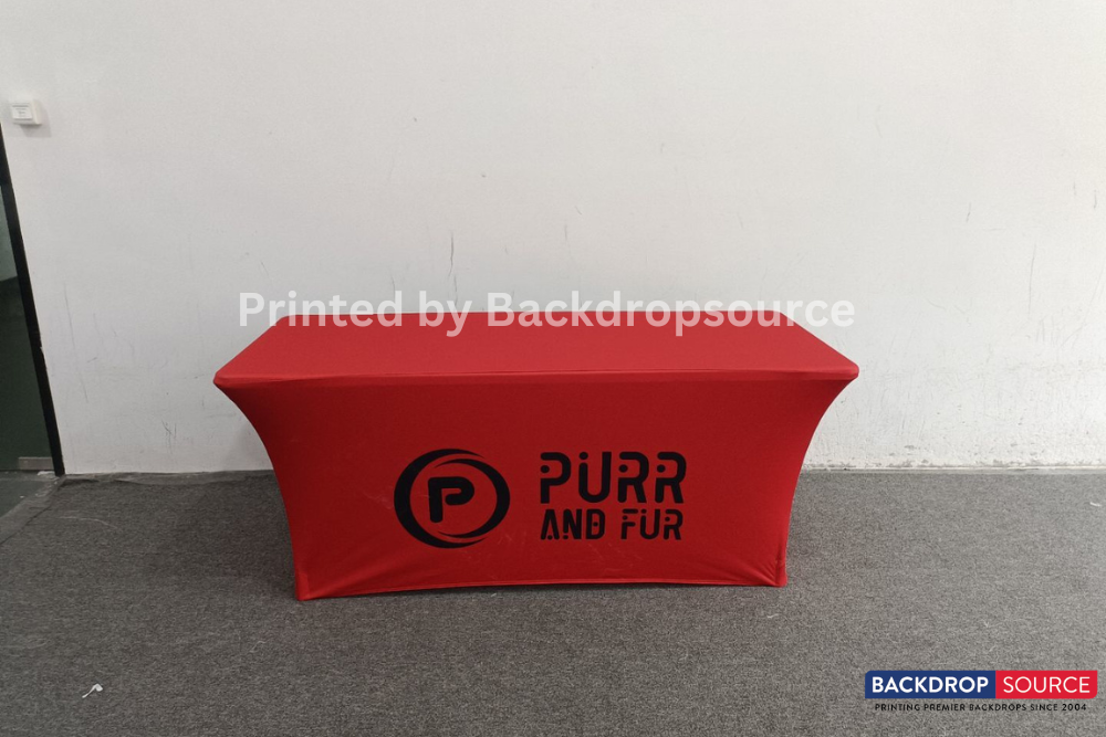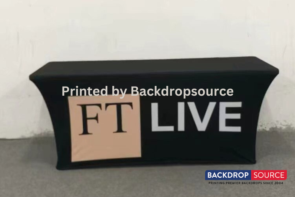 Tablecloths are an essential part of any trade show. Printing your logo, slogan or any other message on your table cloth automatically completes your branding and speaks volumes about your company image. At Backdropsource Printing, we offer 3- and 4-sided tablecloths that are great not only for your branding, but can also hide all those boxes under your table. Our tablecloths are sublimated and are 100% washable. It is made of polyester table cloth with rounded corners that hang approximately 2.5 inches off the ground.