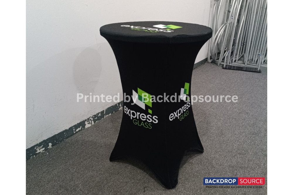 The custom round stretch tablecloth cover is an essential part of any trade show. Printing your logo, slogan or any other message on your table cloth automatically completes your branding and speaks volumes about your company image. At Backdropsource Printing, we offer 3- and 4-sided tablecloths that are great not only for your branding, but can also hide all those boxes under your table. Our tablecloths are sublimated and are 100% washable. It is made of 8.8 oz. polyester table cloth with rounded corners.